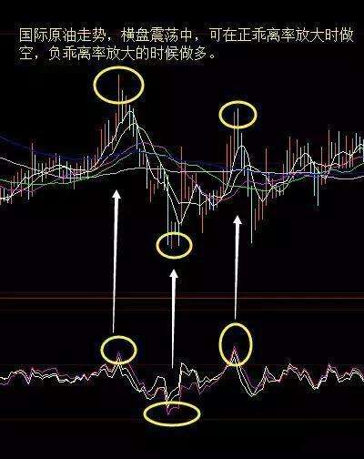 4,横盘震荡:箱体震荡的时候,若均线保持多线粘合缠绕,并保持水平运行,可在正乖离率放大的时候做空,负乖离率放大的时候做多。